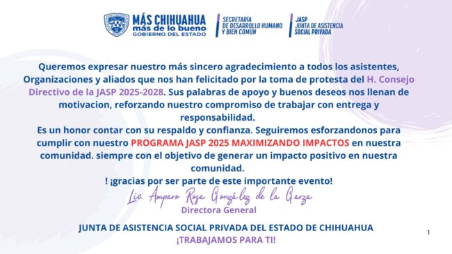 La Junta de Asistencia Social Privada agradece a todos los asistentes y aliadas que nos han felicitado por la Toma de Protesta del H. Consejo Directivo de la JASP 2025-2028