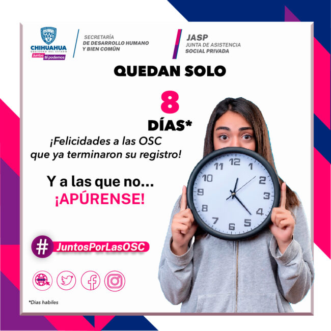 𝗔𝗧𝗘𝗡𝗖𝗜𝗢́𝗡 𝗔 𝗧𝗢𝗗𝗔𝗦 𝗟𝗔𝗦 𝗢𝗦𝗖 𝗜𝗡𝗧𝗘𝗥𝗘𝗦𝗔𝗗𝗔𝗦 𝗘𝗡 𝗣𝗔𝗥𝗧𝗜𝗖𝗜𝗣𝗔𝗥 𝗘𝗡 𝗟𝗔 𝗖𝗢𝗡𝗩𝗢𝗖𝗔𝗧𝗢𝗥𝗜𝗔 ❞𝗔𝗣𝗢𝗬𝗢𝗦 𝗔 𝗟𝗔𝗦 𝗢𝗥𝗚𝗔𝗡𝗜𝗭𝗔𝗖𝗜𝗢𝗡𝗘𝗦 𝗗𝗘 𝗟𝗔 𝗦𝗢𝗖𝗜𝗘𝗗𝗔𝗗 𝗖𝗜𝗩𝗜𝗟 𝟮𝟬𝟮𝟯❞ Te recordamos que la convocatoria cerrara el día 4 de septiembre, por lo que 𝘀𝗼𝗹𝗼 𝗾𝘂𝗲𝗱𝗮𝗻 𝟖 𝗱𝗶́𝗮𝘀 hábiles para terminar correcto el registro. Para la JASP es muy importante que todas las OSC pasen…