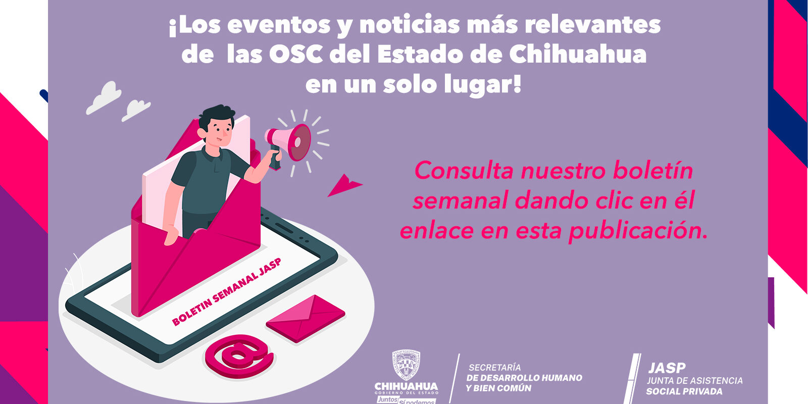 BoletínNoticias SemanalBoletín Semanal No. 26 Categorías: Boletín, Noticias SemanalDeja un comentarioNavegación entre publicacionesAnteriorPublicación anterior:6. H. CONGRESO DEL ESTADO JUNIOSiguientePublicación siguiente:¡AVISO IMPORTANTE!Ver MásCerrando con éxito el Programa JASP 2025–2027 “Maximizando Impactos”, 2do. Foro sede Ciudad Juárez.marzo 24, 2026Programa 2025–2027 “Maximizando Impactos” 2do Foro sede Juárezmarzo 23, 2026Arranque del curso de Brigadas Multifuncionalesenero 26, 2026Acercamiento institucional con la AMCPenero 26, 2026Reunión estratégica para fortalecer a las OSCenero 26, 2026FINALIZA LAS FIRMAS DE LOS CONVENIOS DE LAS OSC DEL PROGRAMA «APOYO A LAS ORGANIZACIONES DE LA SOCIEDAD CIVIL» 2025agosto 20, 2025