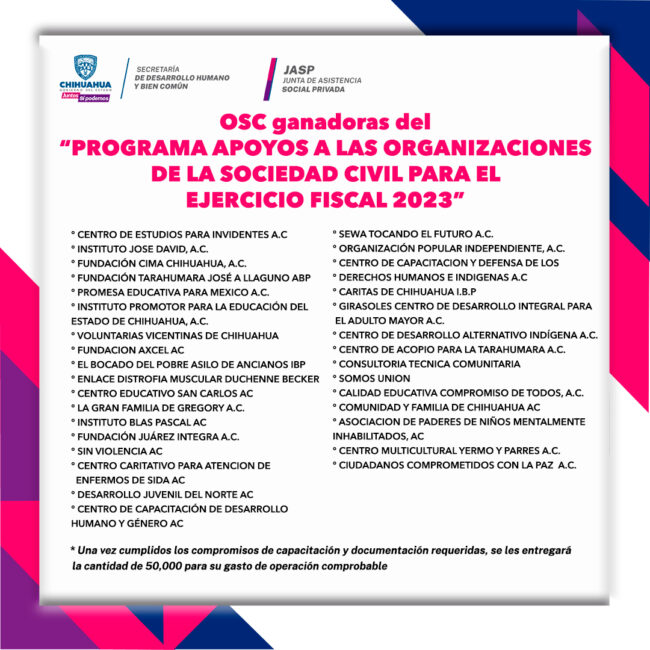 La Junta de Asistencia Social Privada del Estado de Chihuahua invita a las Organizaciones de la Sociedad Civil con constancia 2025 a participar en la convocatoria pública «APOYOS A LAS ORGANIZACIONES DE LA SOCIEDAD CIVIL» para el ejercicio fiscal 2025.