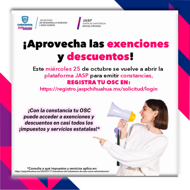 ¡Prepárense! ¡Mañana se abre la plataforma JASP! ¿Tu OSC tiene recargos en el consumo de agua? ¡Regístrala con nosotros y obtén un descuenton! Además, tu OSC puede acceder a todos estos beneficios por pertenecer al directorio estatal de OSC´s: Incentivos y estímulos fiscales. Exención (descuento) de pago de impuestos, derechos y contribuciones: Sobre nómina Sobre…