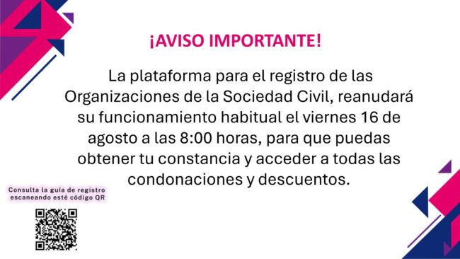 La plataforma para el registro de las Organizaciones de la Sociedad Civil, reanudará su funcionamiento habitual el viernes 16 de agosto a las 8:00 horas, para que puedas obtener tu constancia y acceder a todas las condonaciones y descuentos.