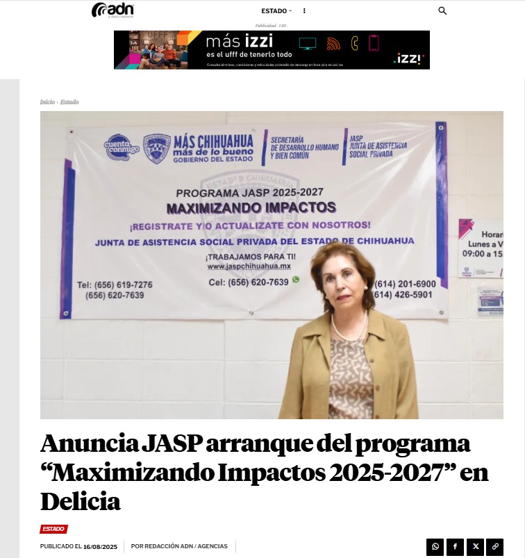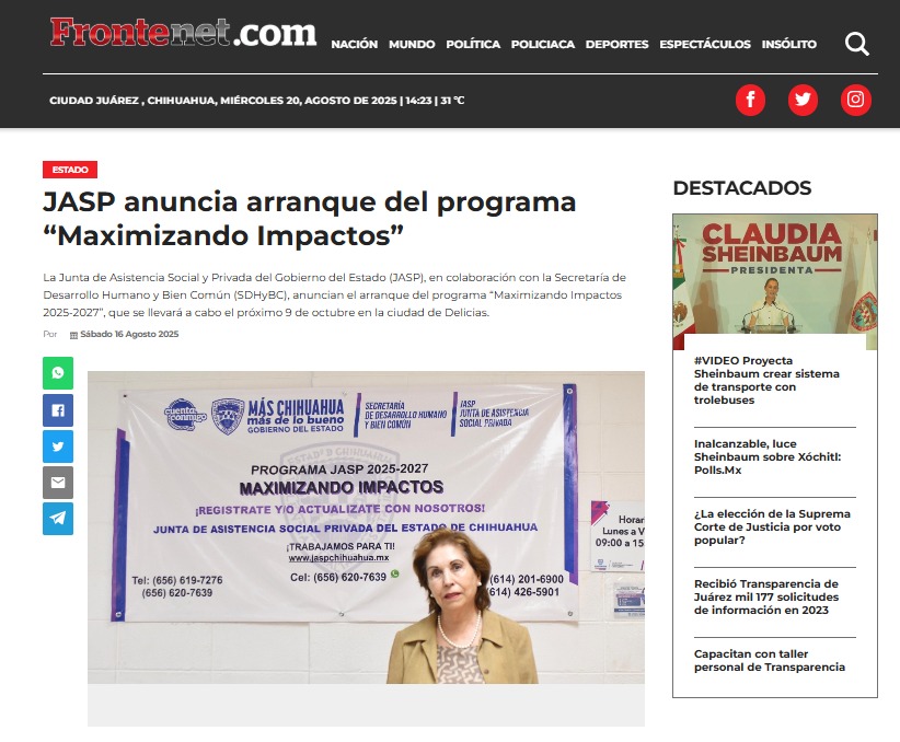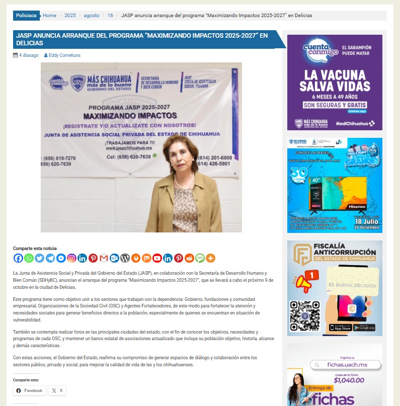 NoticiasNoticias SemanalPrincipalLa Junta de Asistencia Social Privada dio a conocer el programa JASP 2025-2027 Maximizando Impactos Fuente Adiario.mx Ver aquí Fuente Frontenet.com Ver aquí Fuente Fronteraelite.com Ver aquí Categorías: Noticias, Noticias Semanal, PrincipalDeja un comentarioNavegación entre publicacionesAnteriorPublicación anterior:Rueda de Prensa sobre el Proyecto Maximizando ImpactosSiguientePublicación siguiente:FINALIZA LAS FIRMAS DE LOS CONVENIOS DE LAS OSC DEL PROGRAMA «APOYO A LAS ORGANIZACIONES DE LA SOCIEDAD CIVIL» 2025Ver MásCerrando con éxito el Programa JASP 2025–2027 “Maximizando Impactos”, 2do. Foro sede Ciudad Juárez.marzo 24, 2026Programa 2025–2027 “Maximizando Impactos” 2do Foro sede Juárezmarzo 23, 2026Arranque del curso de Brigadas Multifuncionalesenero 26, 2026Acercamiento institucional con la AMCPenero 26, 2026Reunión estratégica para fortalecer a las OSCenero 26, 2026La Junta de Asistencia Social Privada impulsará en este año foros para maximizar el impacto social en Chihuahua.enero 26, 2026